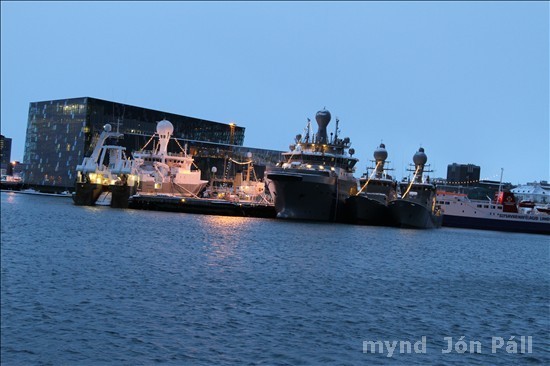 Hin fræga Harpa, hafrannsóknarskipin, varðskipin og slysavarnarskóli sjómanna í Reykjavíkurhöfn nú um jólin