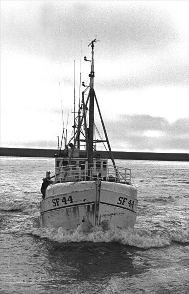 Reknetabáturinn 787. Sigurður Ólafsson SF 44, siglir um Hornafjarðarós til hafnar