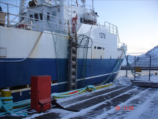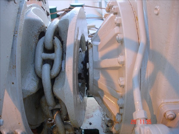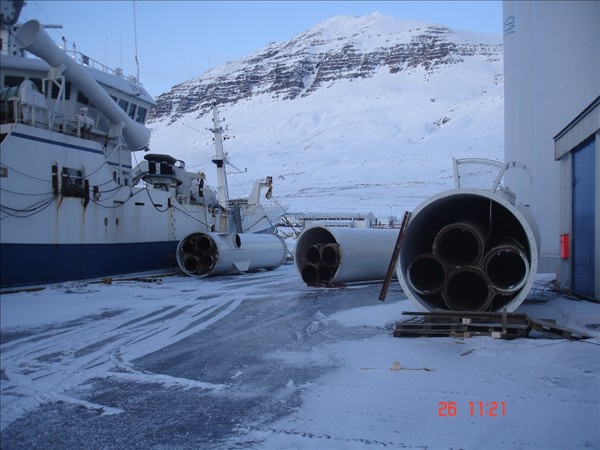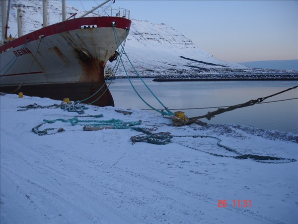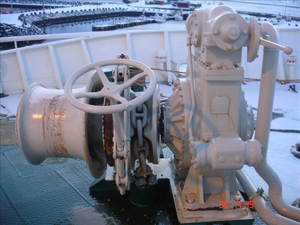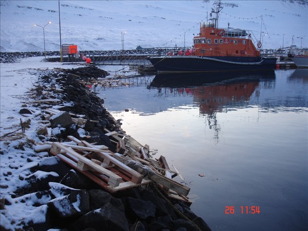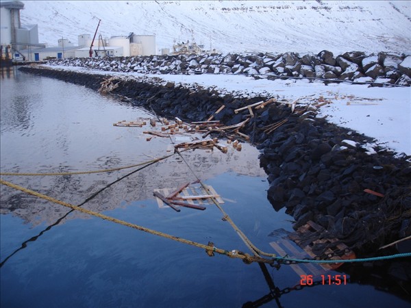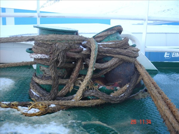 Bjarni Guðmundsson, Neskaupstað: Myndirnar af festipollanum og ankerisspilinu eru teknar um borð í Barða NK en eitt landfestatóg var á spilkoppnum og bognaði öxullinn í spilinu í látunum. Einnig brotnaði bryggjupolli við Bjart NK. Strompur sem reisa á við bræðsluna fór af stað og endaði á landgangi við Beitir NK. En strompurinn er í þrem hlutum, einn hlutinn stoppaði á miðri bryggju,