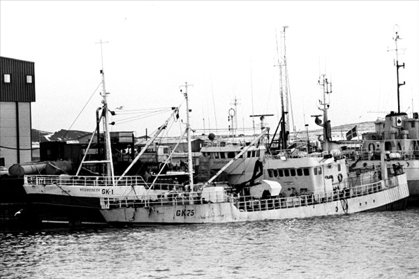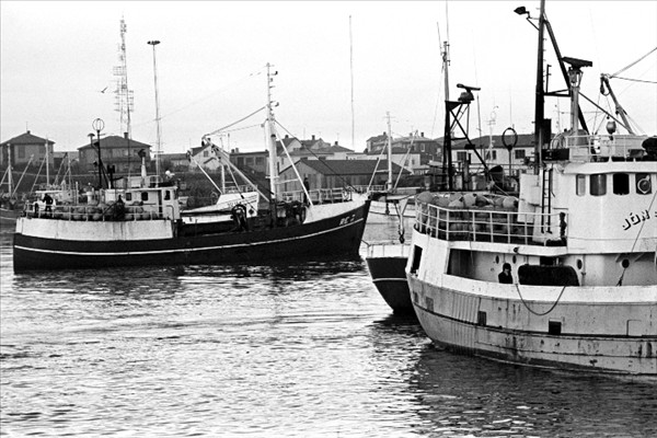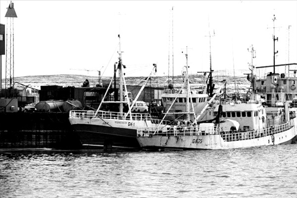 979. Víkurberg GK 1 og 1501. Þórshamar GK 75, bíða þess að landa fullfermi af loðnu í Grindavík á árinu 1988 © myndir Kristinn Benediktsson