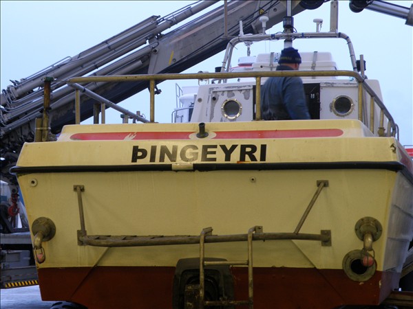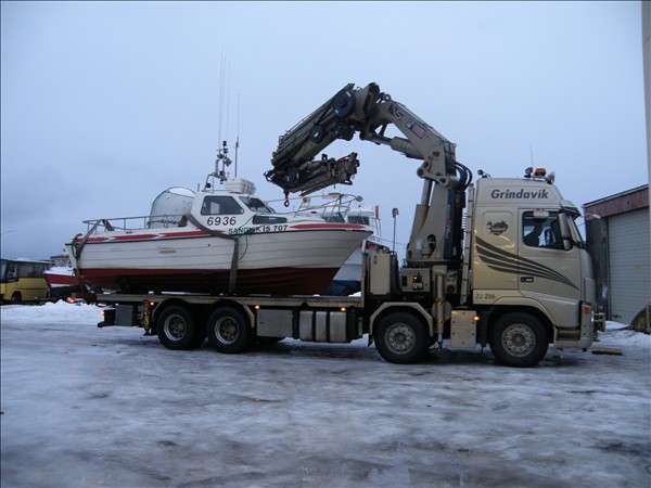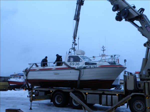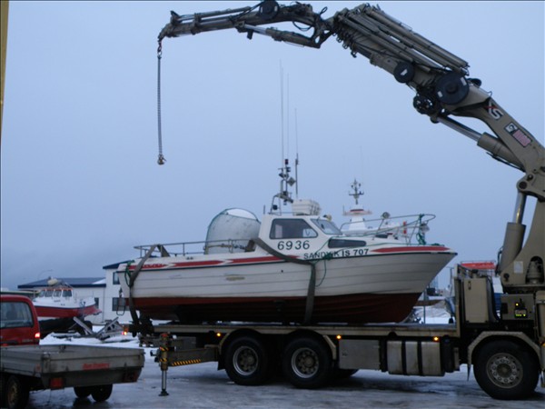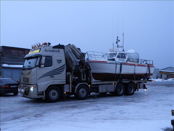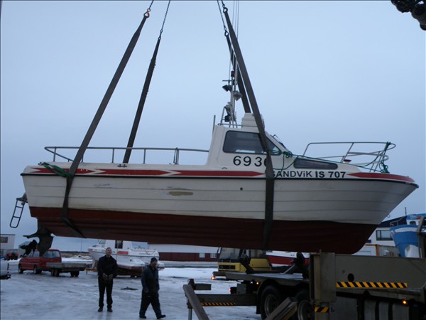 Flutningabíllinn frá Jóni & Margeiri með 6936. Sandvík ÍS 707, kominn á athafnarsvæði Sólplasts í Sandgerði. Gerfihnattarkúlan sem er um borð í Sandvík er bátnum óviðkomandi.