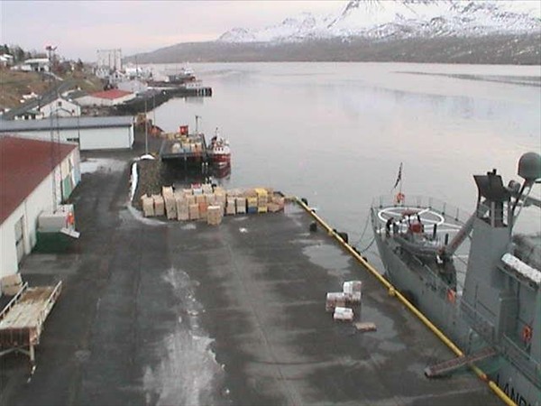 1066. Ægir á Fáskrúðsfjörður. Kjötbollum, bjúgum o.fl. vistum skipað um borð fyrir brottför í gær © myndir Óðinn Magnason af vefmyndavél staðarins, 30. jan. 2012