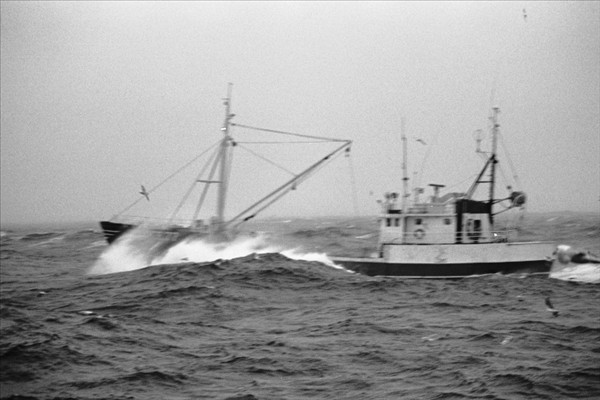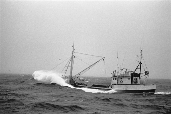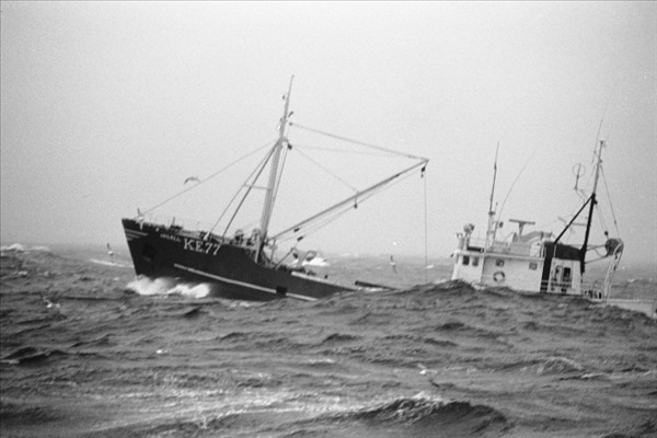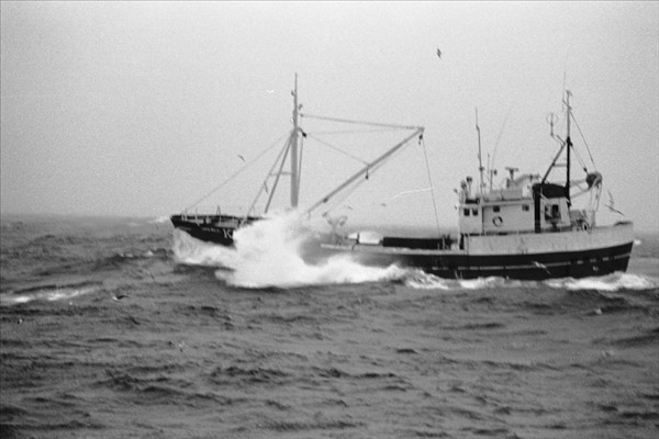 Ársæll KE 77 í brælu að sigla milli trossa á netaslóð suður af Grindavík, árið 1975