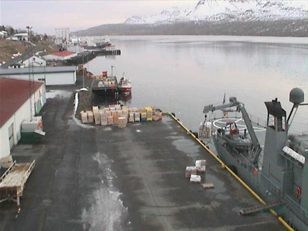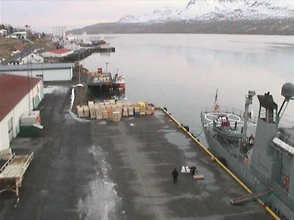 Óðinn Magnason tók þessar myndir í gær af vefmyndavélinni á Fáskrúðsfirði og sést þar þegar skipað er vistum um borð í Ægi m.a. kjölbollum og bjúgum, rétt fyrir brottför.