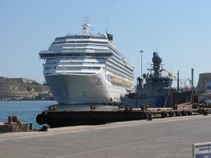 Mikill stærðarmundur á Costa Concordia og 1421. Týr, en myndin var tekin í höfninni í Valetta, á Möltu, sumarið 2009 © mynd af vef Landhelgisgæslunnar