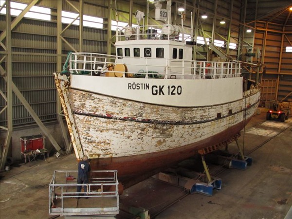 923. Röstin GK 120, í Bátaskýlinu í Njarðvik, eftir að búið var að hreinsa síðustu málningu af skrokknum
