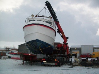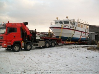 Í dag var farið af stað með Kidda Lár frá Sólplasti áleiðis til Siglufjarðar þar sem hann verður lengdur. Raunar voru menn svo bjartsýnir að þeir ætluðu að ganga frá flutningunum í gær, en urðu að láta í minni pokann fyrir veðrinu. Þrátt fyrir að um stóran bát væri að ræða tókst vel að koma honum á flutningavagn og var ekið inn að Straumsvík en þar átti að bíða þar til á þessum mínútum að það má fara með svona stóran farm í gegn um höfuðborgarsvæðið.