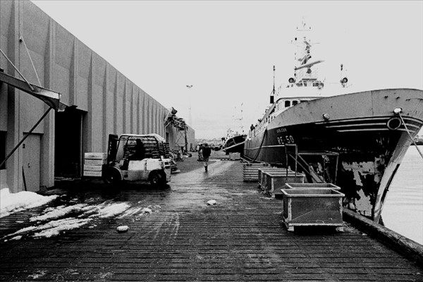 Togarar Ísbjarnarins landa fyrir framan nýtt frystihús í Reykjavík