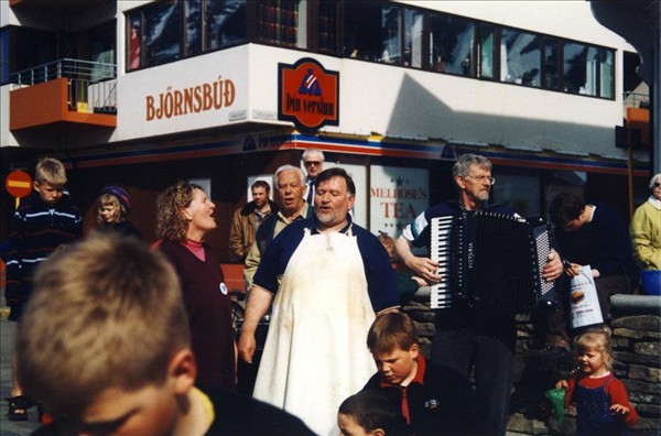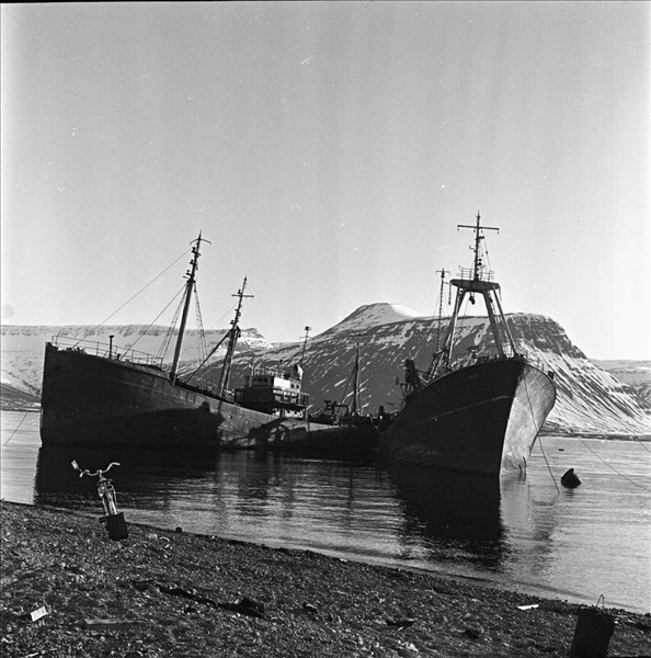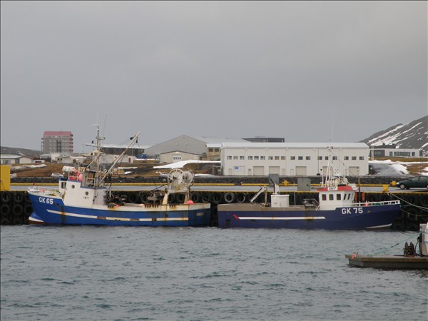 Hér sjáum við þjóðþekktan mann með svuntu fyrir miðri mynd. Hann hefur verið skipstjóri, formaður pólitískra samtaka svo samtaka sjómann, auk þess að vera að sjálfsögðu alþingismaður. Milli manna gengur hann undir nafnu Addi Kidda Gau, en heitir réttu nafni Guðjón Arnar Kristjánsson og trúlega er það pólitísk uppákoma hjá honum þarna á myndinni. Þessi hægra meginn er Arnarnes ÍS 204 en sá vinstra megin á myndinni er Guðmundur Júní ÍS, áður Júpíter. Hann bar þarna beinin. Svo má bæta því við a á myndinni er greinilegt frammastur togara handan við Guðmund Júní ÍS. Þar liggur togarinn Notts County, sem strandaði undir Snæfjallaströnd í febrúarveðrinu 1968. Þeir eru semsagt þrír togararnir á myndinni.