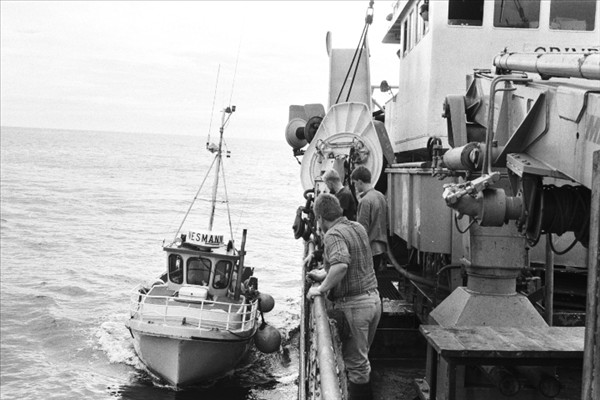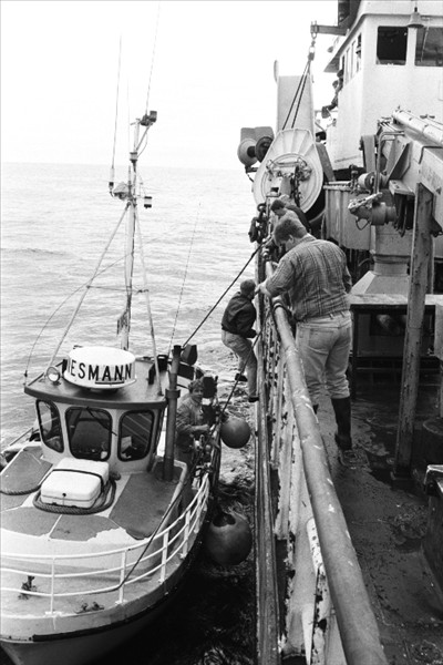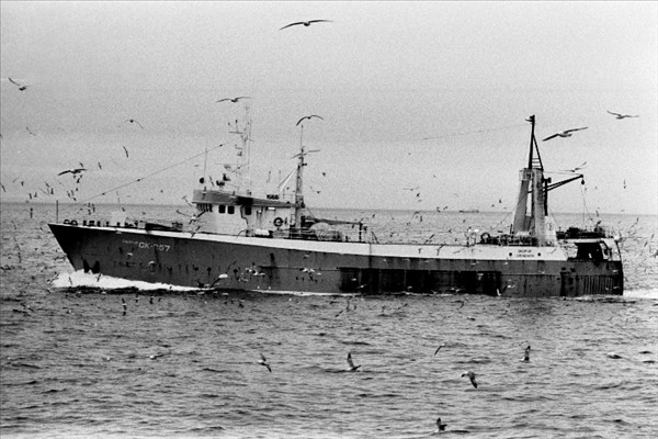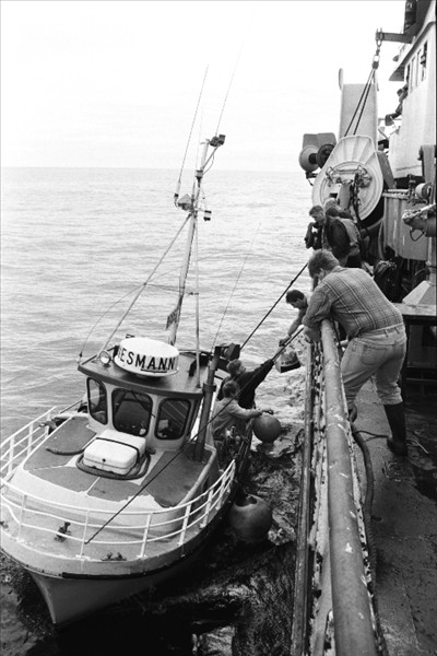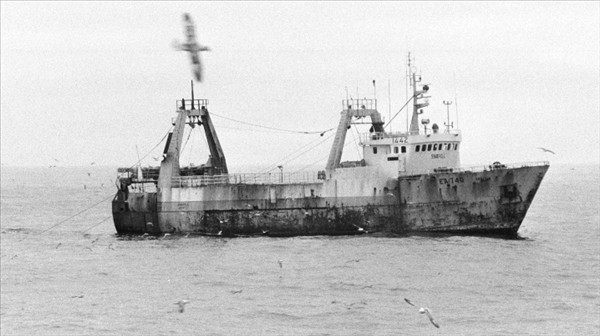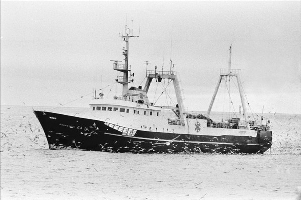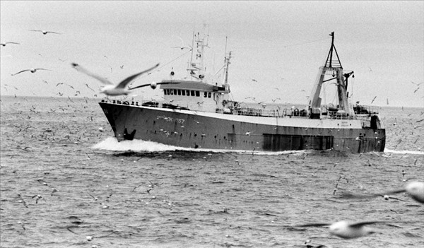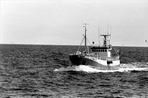 Gnúpur frá Grindavík, á veiðum fyrir vestan. Þetta var vinnsluskip þar sem þorskurinn var flattur í salt, pækilsaltaður i lest © myndir Kristinn Benediktsson, 1988