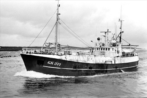 Gnúpur GK, frá Grindavík á veiðum fyrir vestan. Þetta er vinnsluskip þar sem þorskurinn var flattur í salt, pækilsaltaður í lest.