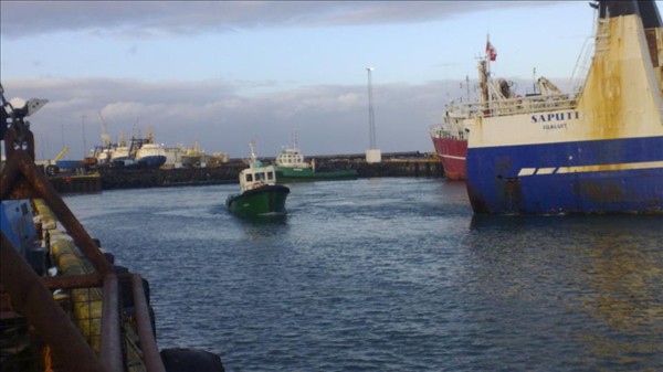 Lódsinn ad adstoda Wilson Calais úr höfn í Eyjum í dag