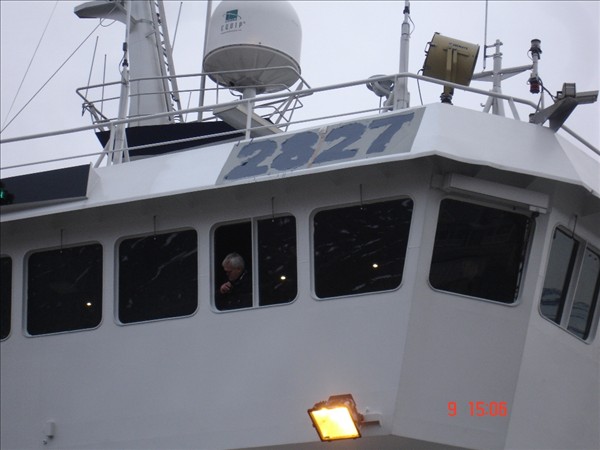 Hér er verið er að snúa skipinu til að merkja bb síðuna. Í brúarglugganum er skipstjórinn Sturla Þórðarson. Skipið á að halda síðan til veiða í kvöld © myndir og texti, Bjarni G. 9. feb. 2012
