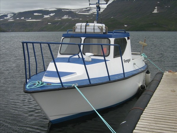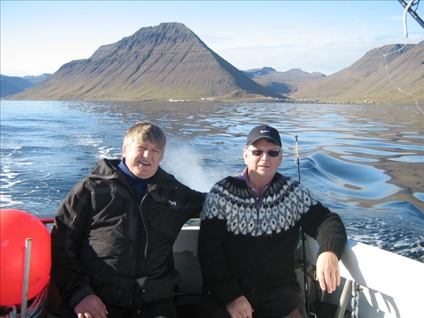 Félagarnir Jens Jónsson og Óli Bjarnason sitja þarna í skutnum á Feng með Hnífsdal og Hraðfrystihúsið- Gunnvör í baksýn.