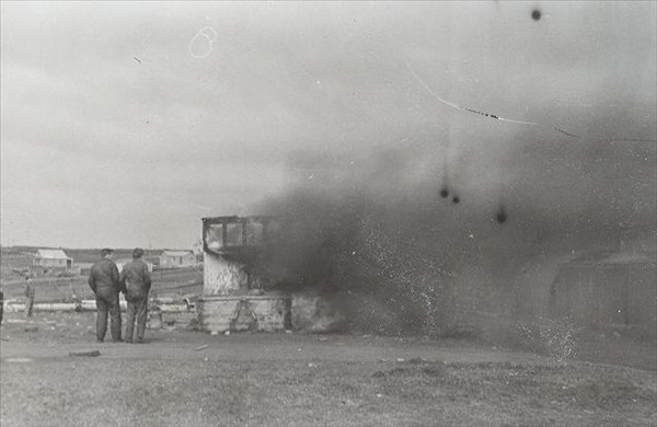 Gamla stýrishúsið af 792. Steinunni Gömlu KE 69 brennur eftir að kveikt var í því © mynd Emil Páll, í maí 1964