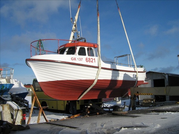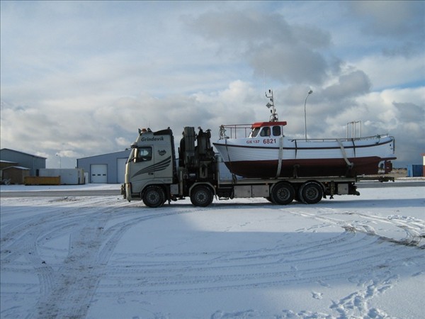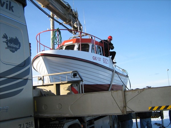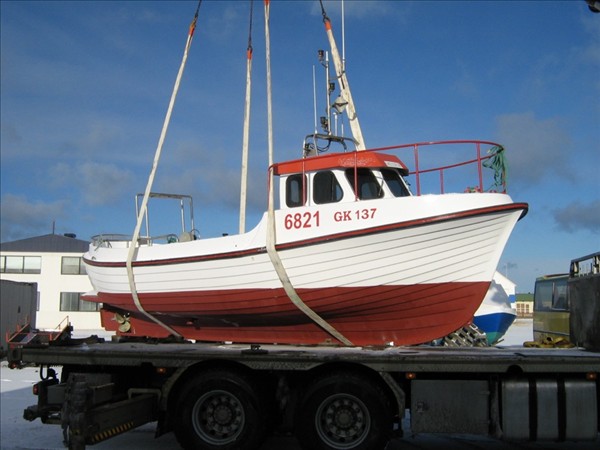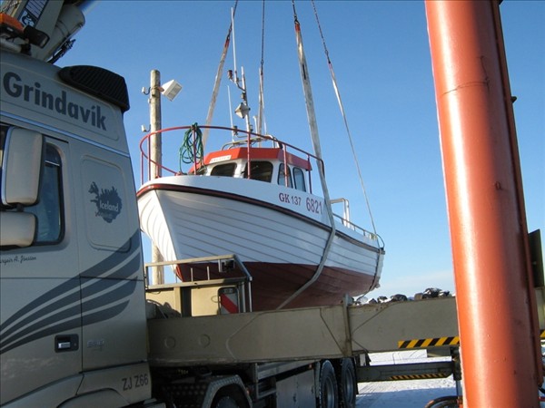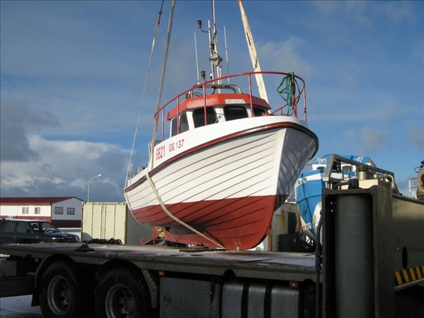 HÉR sjáum við bátinn koma út frá Sólplasti í Sandgerði, settur á flutningavagn sem flutti hann inn í Voga og síðan sjósetningin þar og smá sigling.