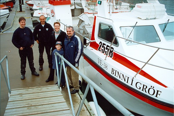 2558. Binni í Gröfn VE 38. Næst bátnum stendur eigandinn Friðrik Benónýsson og við hlið hans eiginkona hans Ragnheiður Alfons og framan við þau nafni bátsins, sonurinn Benóný Friðriksson