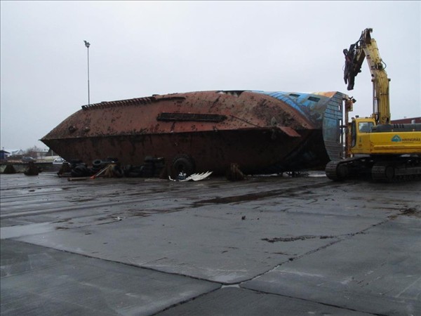 Sæberg HF var fellt á hliðina í dag, en sem kunnugt er þá verður það kurlað niður í Skipasmíðastöð Njarðvikur