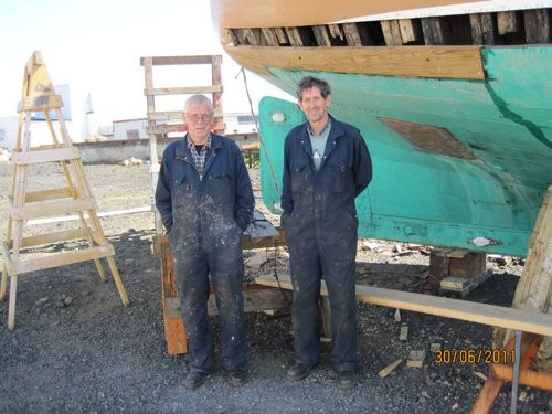 Orginal trébátasmiðir að gera við tréspýtubát í Njarðvíkurslipp