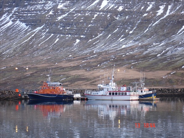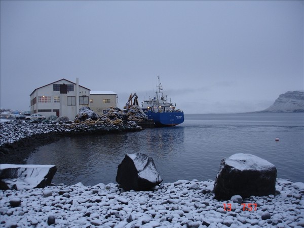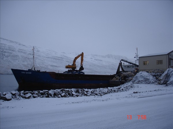 Bjarni Guðmundsson: Hav Sand kom til Neskaupstaðar í morgun og fór upp að netagerðabryggjunni, en skipið kom með loðnunót frá Færeyjum sem Fagrabergið hafði fengið lánaða á loðnuvertíðinni. Svo er mynd af Hafbjörgu Skrúð og Anný SU. Hvít jörð var í morgun en nú er autt upp í miðjar fjallshlíðar eins og sést á myndunum