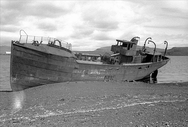 ÞETTA MUN VERA ÍSLENDINGUR RE -120, SEM LIGGUR ÞARNA Í FJÖRUNI FYRIR NEÐAN KLEPPSSPÍTALANN, HANN MUN HAFA VERIÐ SMÍÐAÐUR 1893 OG TEKIN AF SKIPASKRÁ 1961