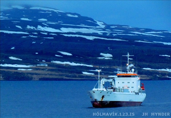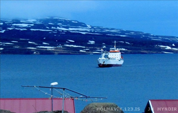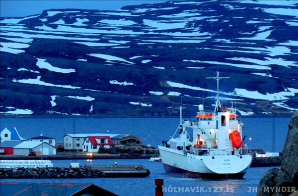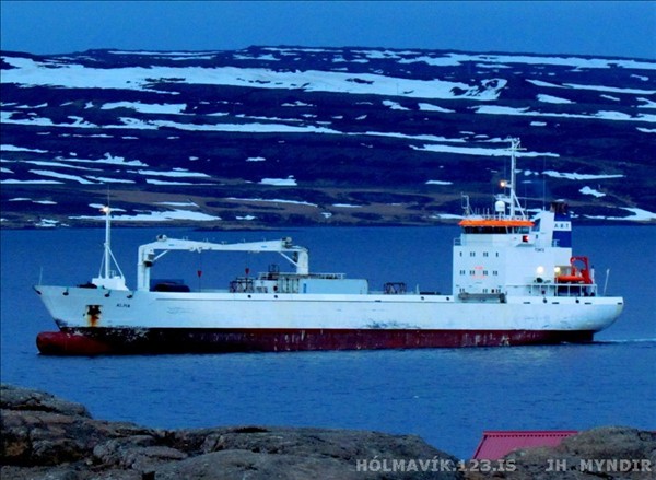 Hið þekkta flutningaskip Alma sem kom við sögu á Austfjörðun fyrir nokkrum mánuðum, er það missti stýrið, en skipstjórinn sagði þó í sjóprófum að skipið hefði ekki þurft á björgun að halda, kom í kvöld til Hólmavíkur og tók Jón Halldórsson þá þessar myndir.