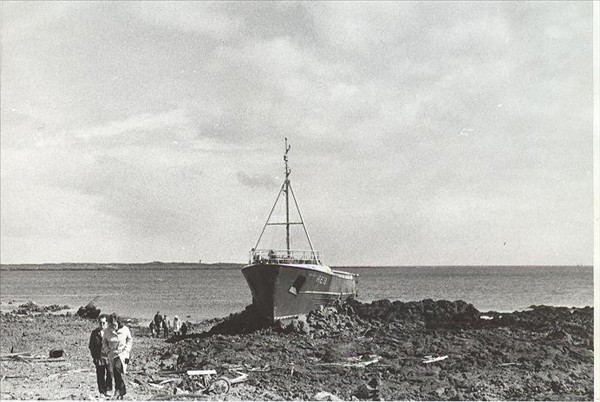Þennan bát var verið að draga inn til Grindavíkur er hann strandaði í innsiglingunni og þar bar hann beinin. Myndirnar tók ég í febrúar 1973, en báturinn var nánast nýr er þetta gerðist.