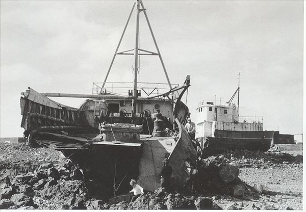 1154. Kópanes RE 8, í nokkrum hlutum í fjörunni í Grindavík © myndir Emil Páll, í feb. 1973
