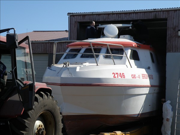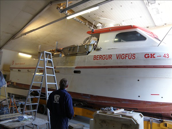 Oft hef ég velt því fyrir mér af hverju aðeins sé byggt yfir báta öðrum megin. Einn þessara er núverandi Bergur Vigfús GK 46, sem í morgun kom til Sólplasts í Sandgerði þar sem byggja á alveg yfir hann. Báturinn var tekinn upp í gullvagninn hjá Skipasmíðastöð Njarðvikur í gær og kom í morgun yfir til Sandgerðis og sjáum við hér myndir er hann var að hverfa inn í hús það sem hann verður í næstu tvær vikur, en sá tími er áætlaður til að ljúka við yfirbygginguna