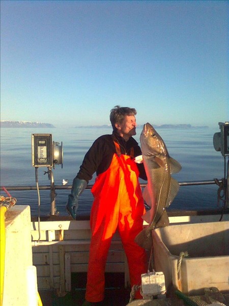 Þessi mynd var tekin núna rétt áðan á miðunum út af Bíldudal og sýnir Þorgrím Ómar Tavsen kyssa þann gula, en Þorgrímur Ómar er nú að róa við annan mann á bát sínu Skvettu SK 7 og leggur upp á Bíldudal, á vegum Arnfirðings ehf. sem er dótturfyrirtæki Grímsness ehf. í Njarðvik. Til stóð að þeir á Skvettu færu á strandveiðar, en fóru í dag í sinn fyrsta róður núna og eru á handfærum, ekki á strandveiðum heldur samkvæmt kvóta og voru á miðunum er ég ræddi við Þorgrím Ómar núna fyrir stundu og einmitt meðan við voru að tala saman beit á hjá honum.