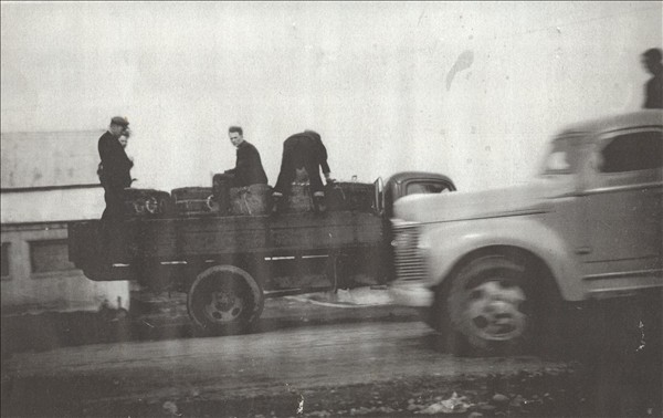 Bjóð tekin um borð í bát í Keflavíkurhöfn. Um er að ræða trébala