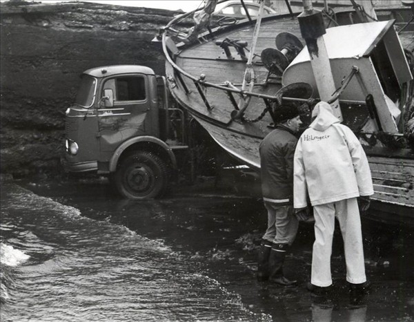 F.v. Vörubíllinn í fjörunni, 1217. Sóley KE 15, 712. Kristján KE 21, 1518. Hafsteinn ÁR 80, 1226. Hlýri GK 305 og 526. Halldór Kristjánsson GK 93, í Sandgerði 5. jan. 1984