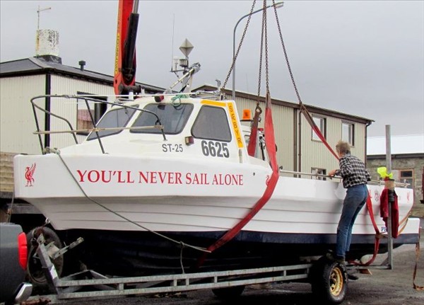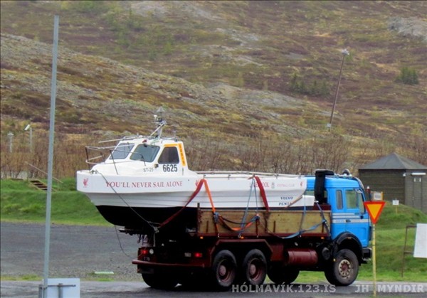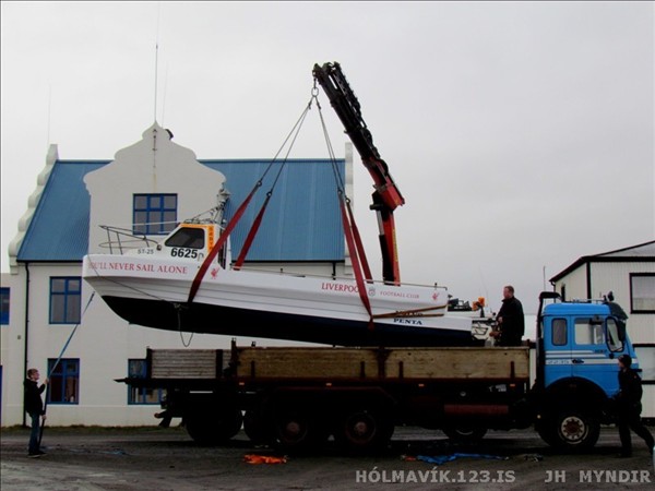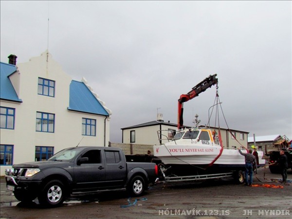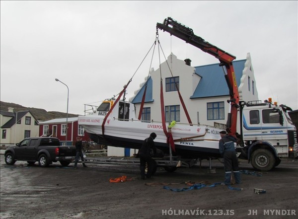 Flutningur á þessum báti frá Ólafsvík í gær til Hólmavikur, hefur verið til umfjöllunar á þremur síðum sem ég hef tengsld á, en engu að síður ætla ég að segja frá þessu og er þar með fjórða síðan sem það gerir. Fyrir valinu voru myndir af síðu Jóns Halldórssonar, holmavik.123.is
