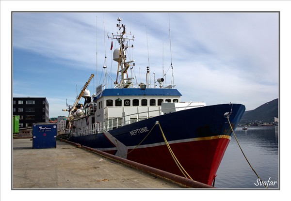 Kom í gær til Tromsö og um borð í rannsóknarskipið Neptune. Þetta skip er mér ekki með öllu ókunnugt þar sem ég vann töluvert í þessu skipi á sínum tíma í Akureyrarslipp þegar það var keypt til Skagastrandar 1995 og hét þá Betty HU. Núna erum við á útleið frá Tromsö í Barentshafið með slatta af vísindamönnum sem munu taka botnsýni vegna olíuleitar.