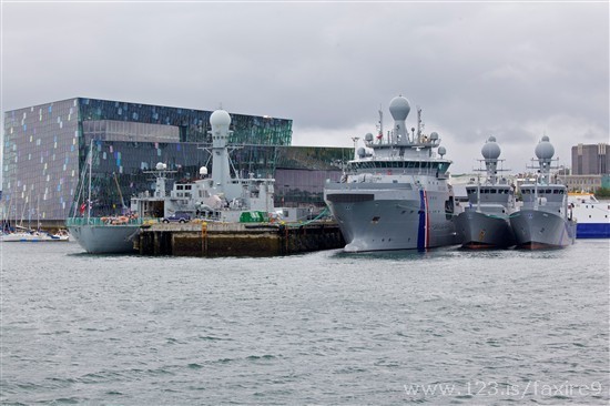 Hvidbjörnen F 360, 2789. Þór, 1421. Týr og 1066. Ægir, í Reykjavíkurhöfn © mynd Faxagengið, faxire9.123.is 21. júlí 2012