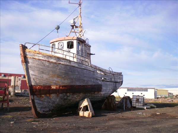Hér sjáum við bát sem stóð lengi uppi í Njarðvíkurslipp en var að lokum brotinn niður. Einnig sjáum við sama bát, þegar Heiðar Baldursson er búinn að fótósjoppa myndina af honum.