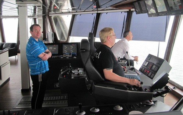 Hér sjáum við Einar Örn Einarsson við stjórnvölinn á Bourbon Front, en annars hafði hann þetta að segja um myndina: Það þarf að hafa sig allan við að bakka inn rennuna inn í slússuna, grynningar á bæði borð og straumar. Lóðsinn einbeittur að fylgjast með Olympic Princess sem er þarna á undan okkur inn © mynd tekin 27. júní 2012