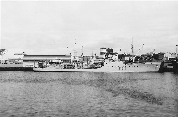Hér koma tvær myndir úr safni Vals Guðmundssonar, sem hann tók í Reykjavíkurhöfn árið 1963 og sýna breskt herskip, sem bar numerið F 85