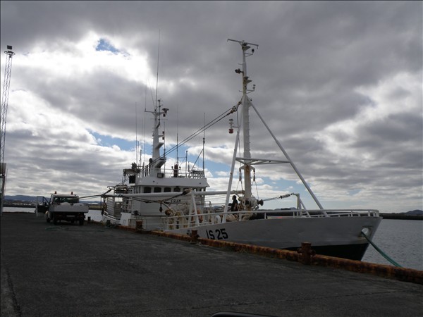 971. Fram ÍS 25 ex Guðrún Guðleifsdóttir ÍS 25, í Njarðvíkurhöfn í morgun. Á efri myndinni er bíll með gúmíbátanna komin að skipshlið © myndir Emil Páll, 3. ágúst 2012