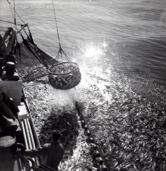 Snæfugl SU 20, að háfa í síðustu sjóferðinni. Skipið sökk út af Seley. 30. júlí 1963. Áhöfnin 10 manns bjargaðist í gúmibjörgunarbát og síðan bjargaði Guðmundur Péturs ÍS 1 mönnunum til lands © myndir Magnús Þorvaldsson, 1963
