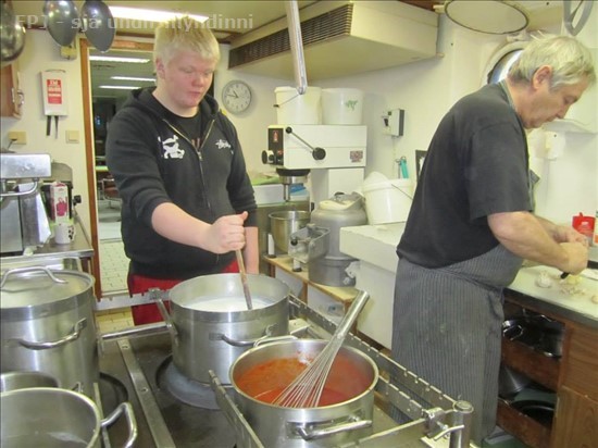 Krissi aðstoðarmatsveinn að hræra í grjónagrautnum meðan Siggi kokkur sinnir öðru. ( 24. nóv.)