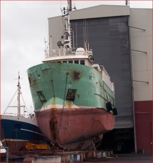 Hér eru tvær myndir sem ég tók í gær er Stígandi VE 77 var kominn framan við bátaskýli Skipasmíðastöðvar Njarðvíkur. Að undanförnu hefur verið unnið við að gera togarann kláran og nú verður hann málaður, sett á hann nýtt nafn sem ég hef áður sagt frá og fleira, en síðar fer hann til veiða frá Vestfjörðum