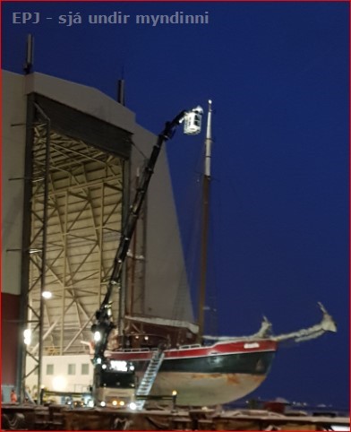 Hér koma myndir sem ég tók snemma í morgun er verið var að setja skútuna Artika, inn í bátaskýli Skipasmíðastöðvar Njarðvíkur. Kom strax í gærkvöldi í ljós að mastrið var aðeins hærra en svo að skútan kæmist inn og því var gripið til þess ráðs að fá Jón & Margeir til að lyfta körfu með mönnum til að stytta aðeins mastrið. Birti ég myndir er sýna atburðinn, fyrst sjáum við skútuna framan við hurð bátaskýlisins, þá sjáum við að Jón & Margeir eru mættir á staðinn og lyftu þeir upp tveimur starfsmönnum sem fyrr segir í körfu til að framkvæma það. Að lokum birti ég mynd af skútunni þegar hún var komin inn.
