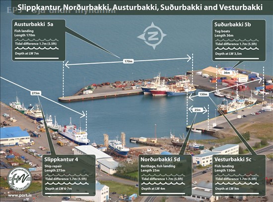 Slippkantur, Norðurbakki, austurbakki, Suðurbakk og vesturbakki, á Akureyri © -mynd af vef Akureyrarhafnar