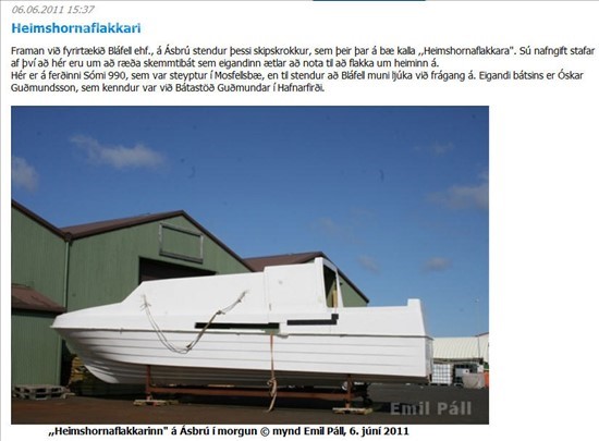 Fyrir nokkrum árum var skrokkur af gerðinni Sómi 990, fluttur til Bláfells á Ásbrú, þar sem átti að fullgera hann, en upphaflega hafði hann verið smíðaður í Mosfellsbæ. Ekki hófst vinna við hann þar og eftir að fyrirtækið fór í þrot tók eigandi skrokksins hann heim til sín úti í Garði og nú hefur hann selt hann og fengu hinir nýju eigendur Sólplast í Sandgerði til að fullgera bátinn og er hann kominn þangað og birti ég nú tvær myndir sem ég tók af skrokknum í morgun, auk frásagnar sem ég birti af skrokknum er hann var kominn upp á Ásbrú, árið 2011.