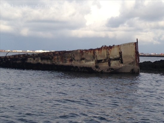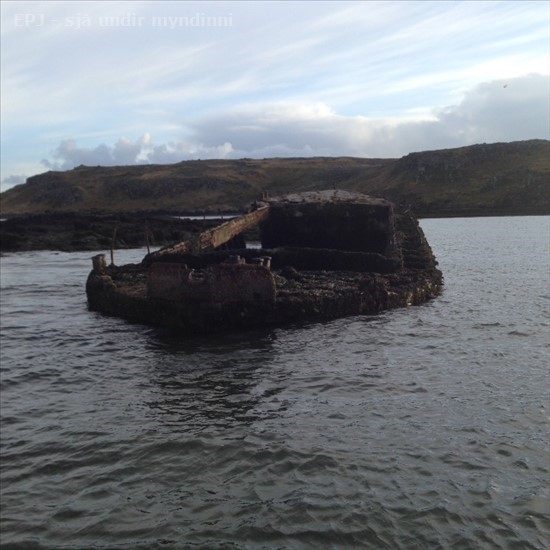 Þetta er einn af innrásarprjámum þeim, er bandamenn smíðuðu til að flytja á herlið sitt til Frakklands 1944. En hvernig stendur á því, að slíkt fartæki er komið hér inn á Vogavík? Sú er saga til þess, að Óskar heitinn Halldórsson keypti nokkra af þessum stóru prjámum eftir stríðið og lét draga þá hingað. Síðan hafa þeir allir, nema þessi eini, verið notaðir til hafnargerðar á þann hátt, að þeir hafa verið fylltir með steinsteypu og síðan sökkt sem steinkerjum, þar sem hafnargarðar hafa verið gerðir.