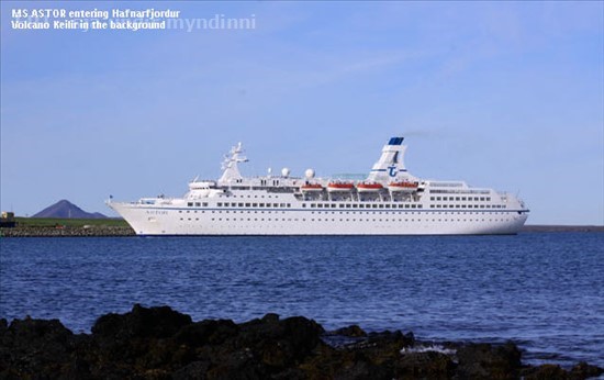 MS Astor, í Hafnarfirði og fjallið Keilir í baksýn á efri myndinni - 2 myndir