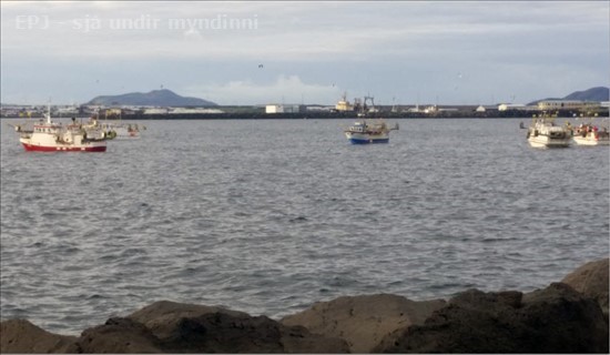 Bátar á makrílveiðum um kl. 7.30 í morgun við og utan við enda hafnargarðsins í Keflavík