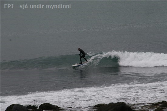 Brimbrettakappar leika sér í öldunni við Auður, knörr Dalakonunnar í Þorlákshöfn © myndir Emil Páll, 4. júní 2017