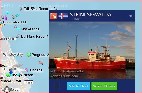Núna áðan tók ég þetta skjáskot af MarineTraffic, sem sýnir Steina Sigvalda þar sem hann siglir á 5.4 mílna hraða í átti til Belgíu með Tjaldanesið í togi.